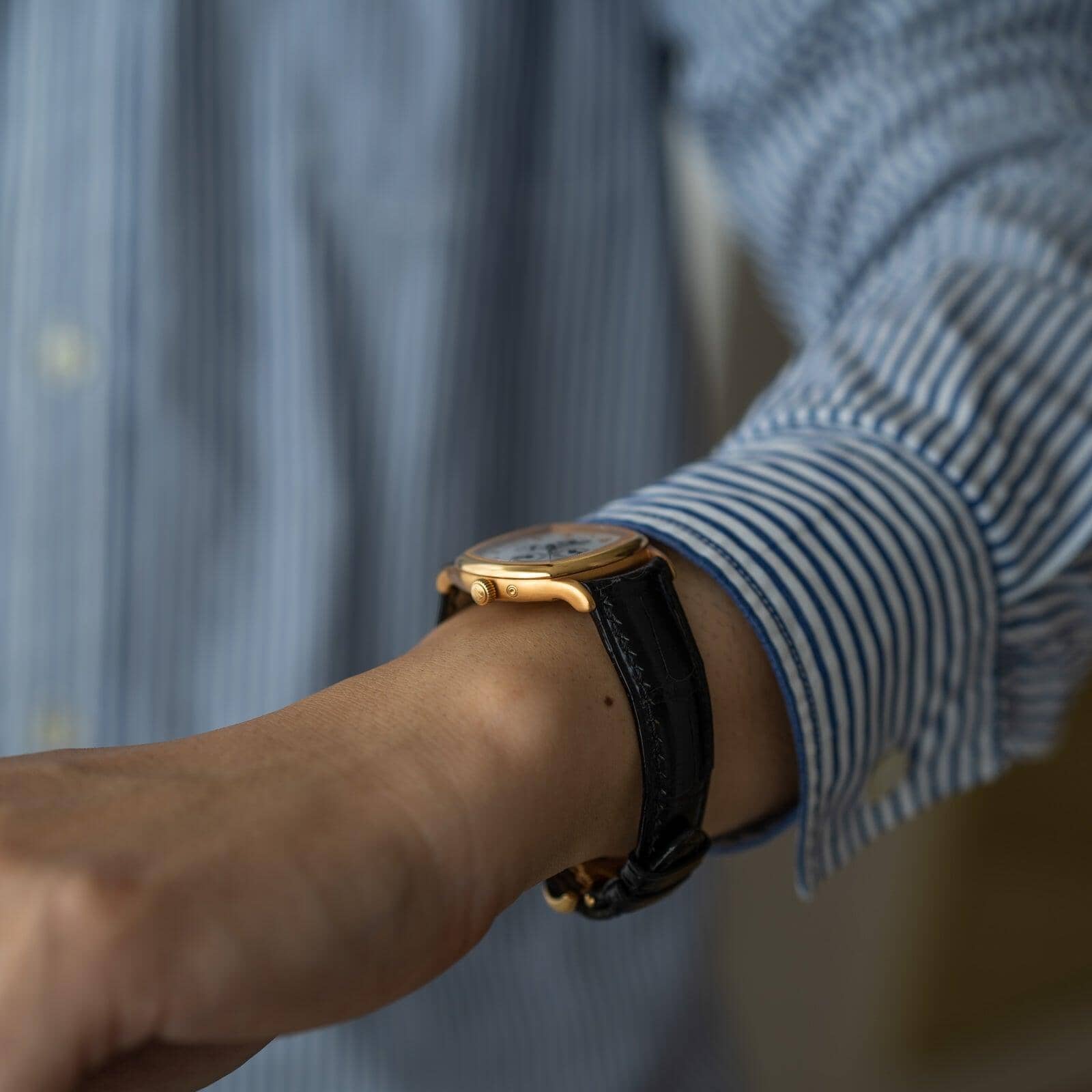 購入当時の箱、時計を収納していたレザーケース、保証書、真正証明書が付属しており、尾錠も純正の18K PGのDバックルとまさに完品と言えるコンディションです。