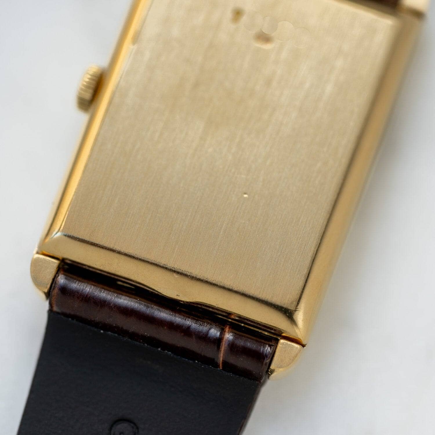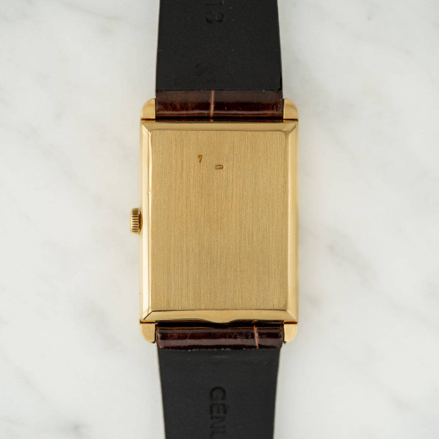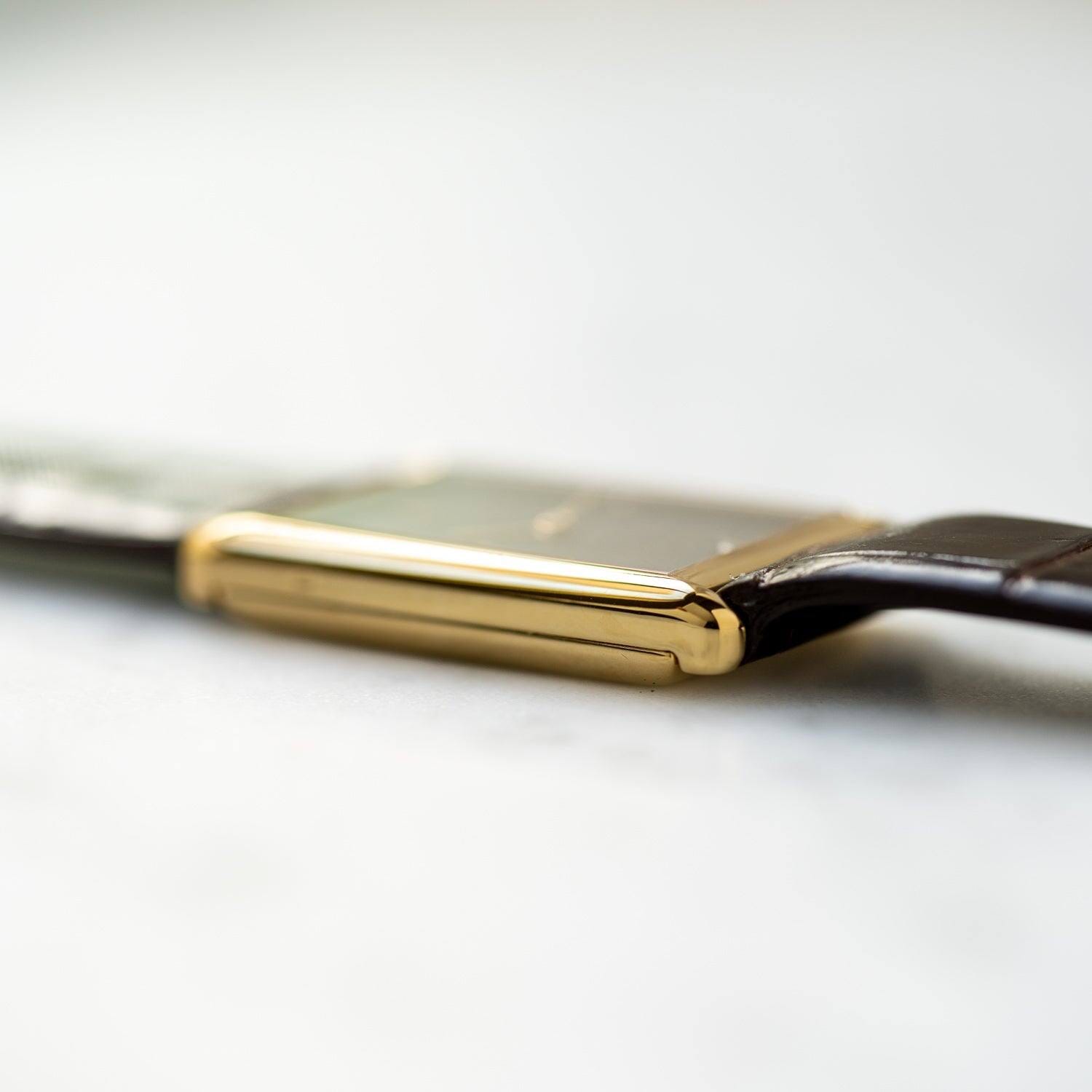 Audemars Piguet dress watch with 18K yellow gold rectanglular case.The dial is a matte black dial. Looks like sand-blasted finish.