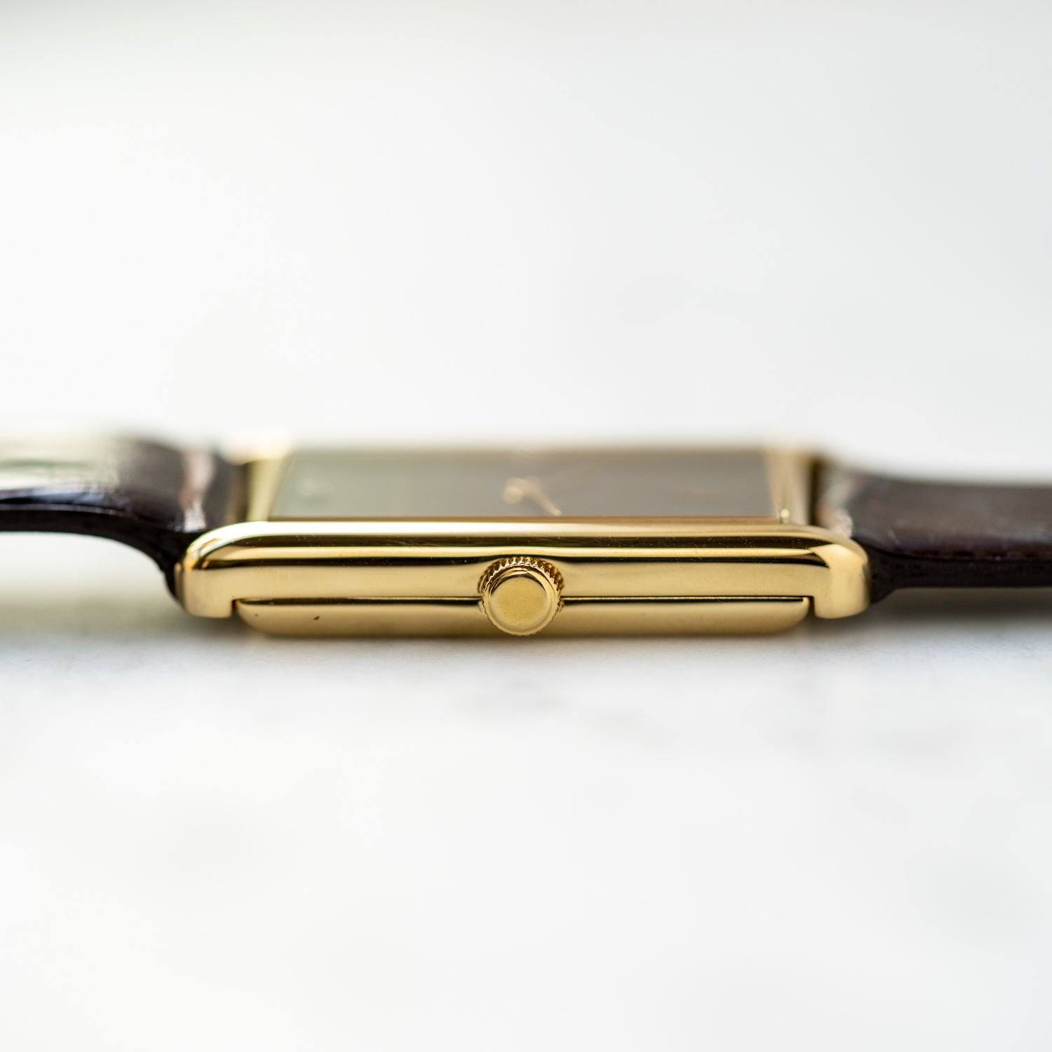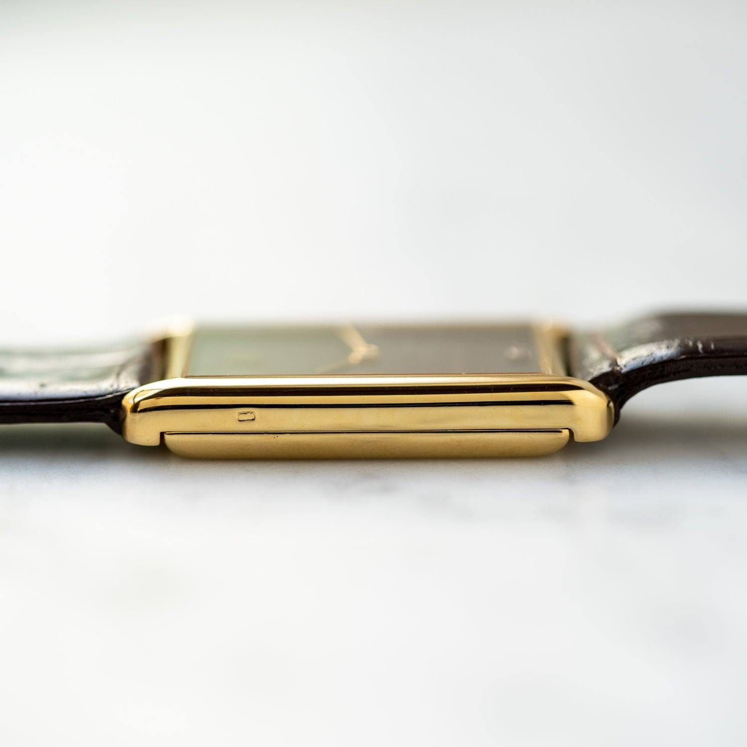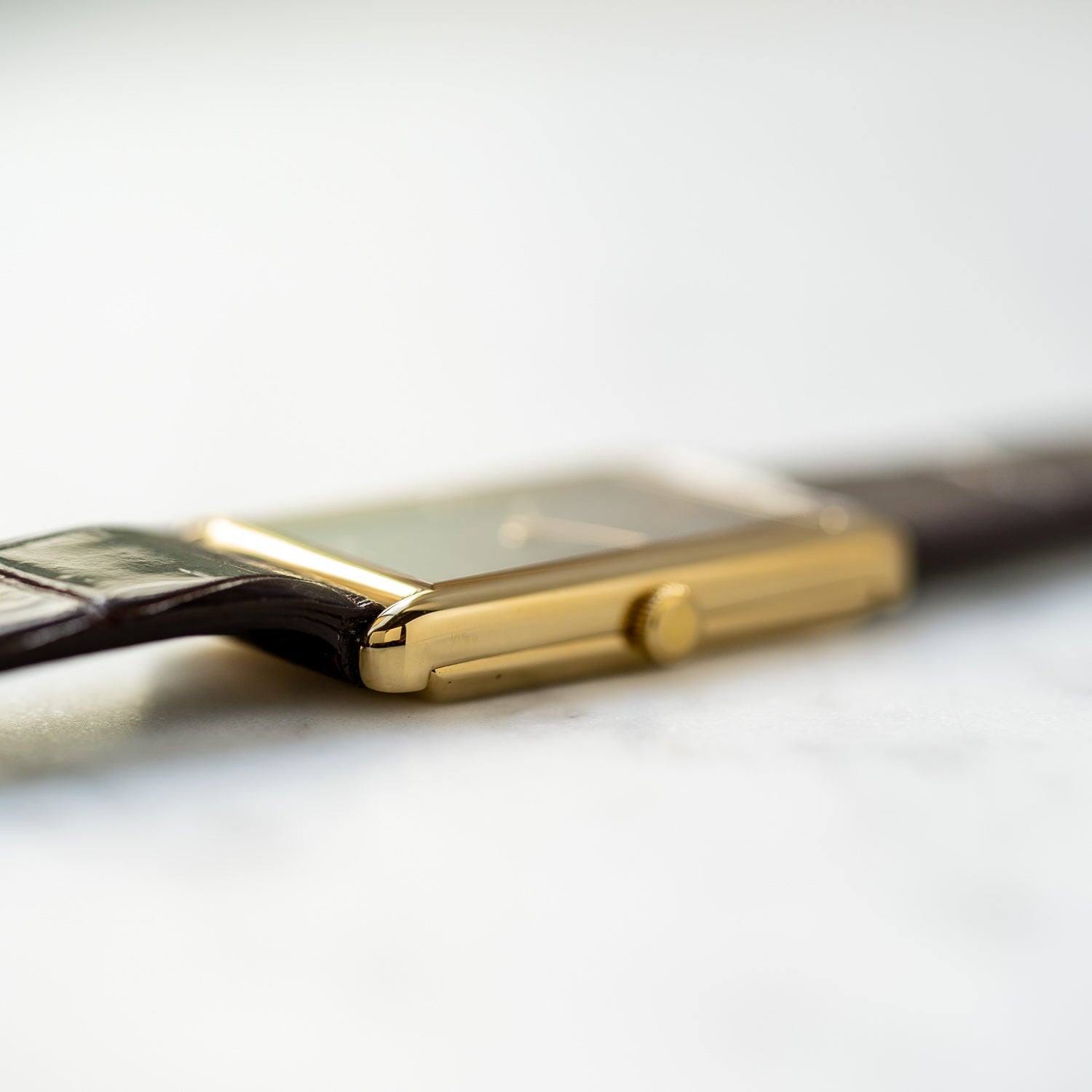 Audemars Piguet dress watch with 18K yellow gold rectanglular case.The dial is a matte black dial. Looks like sand-blasted finish.