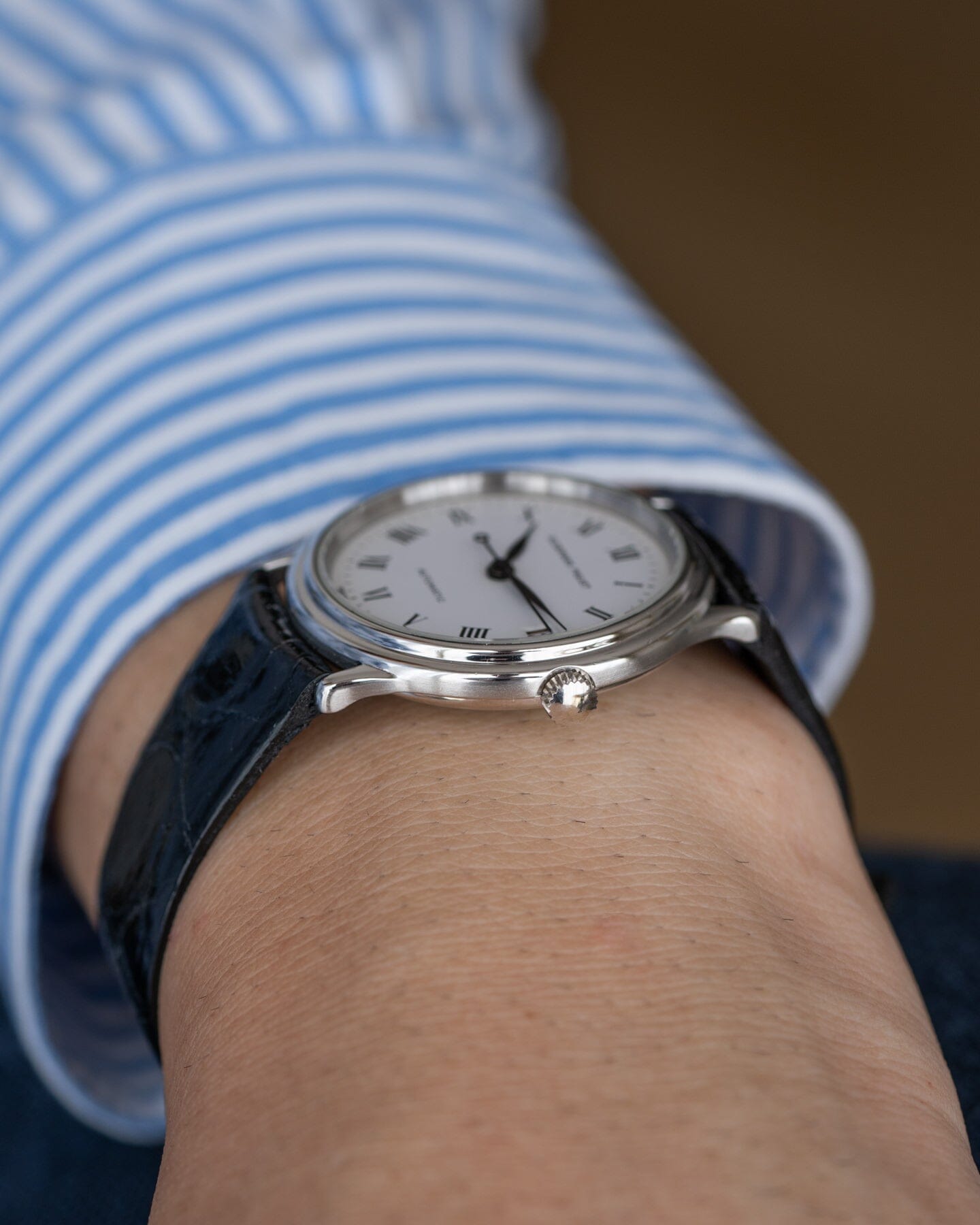 The case size is slightly smaller at 33.5 mm, giving it a vintage feel.