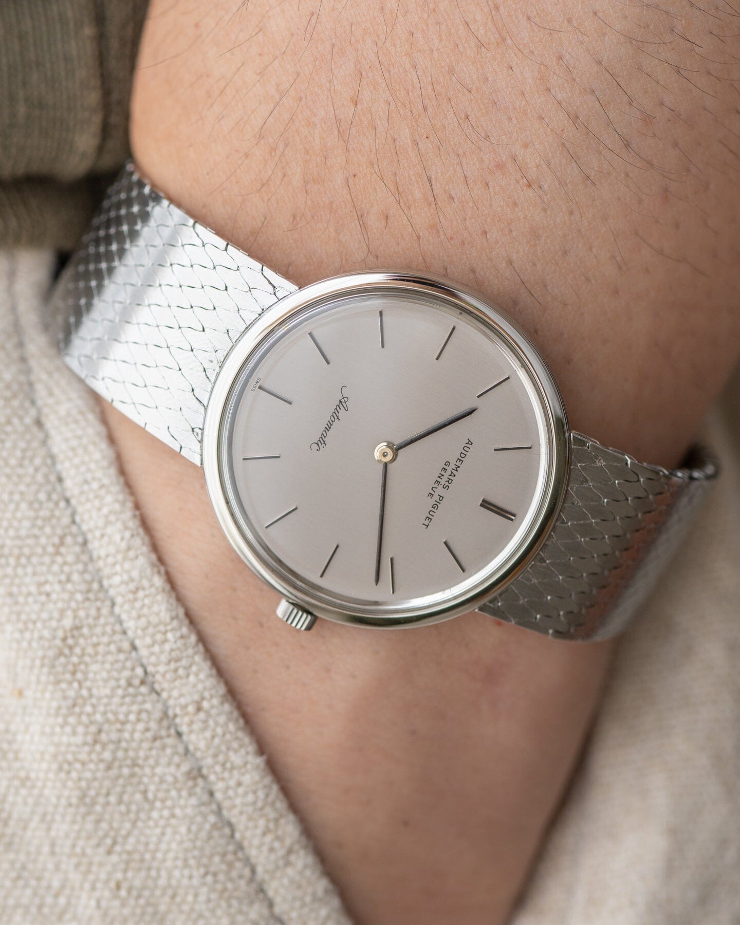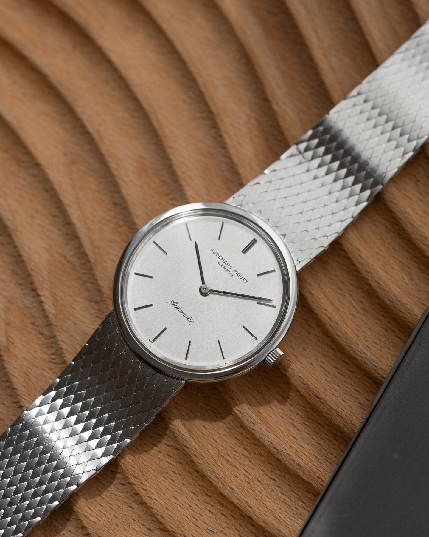 The case is made of stainless steel, which is rare for an AP watch of this era, and has an integrated bracelet.