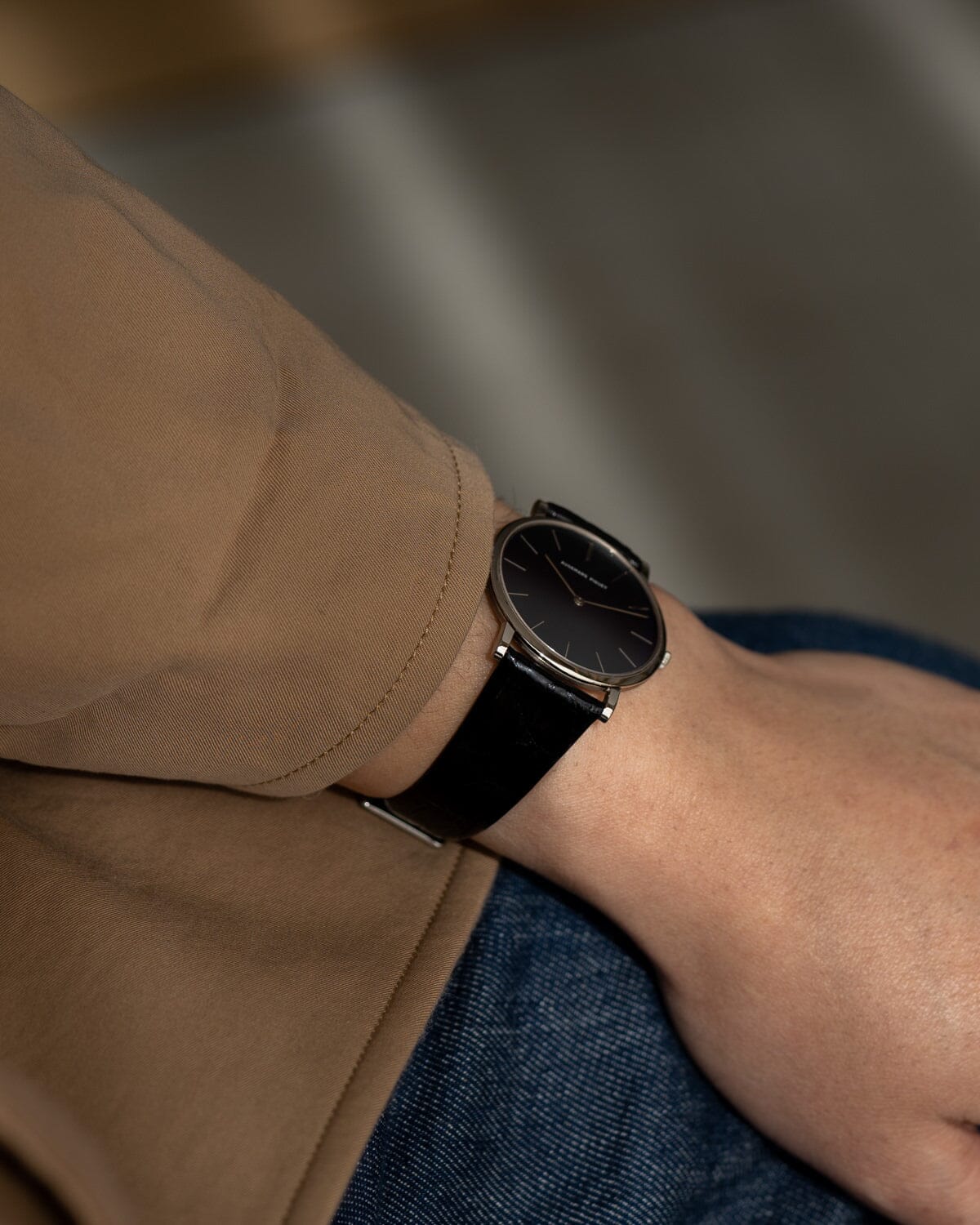 The case size is 35mm, which is rather large for a dress watch of the time, but with the black dial, you don't really feel the size of the watch.