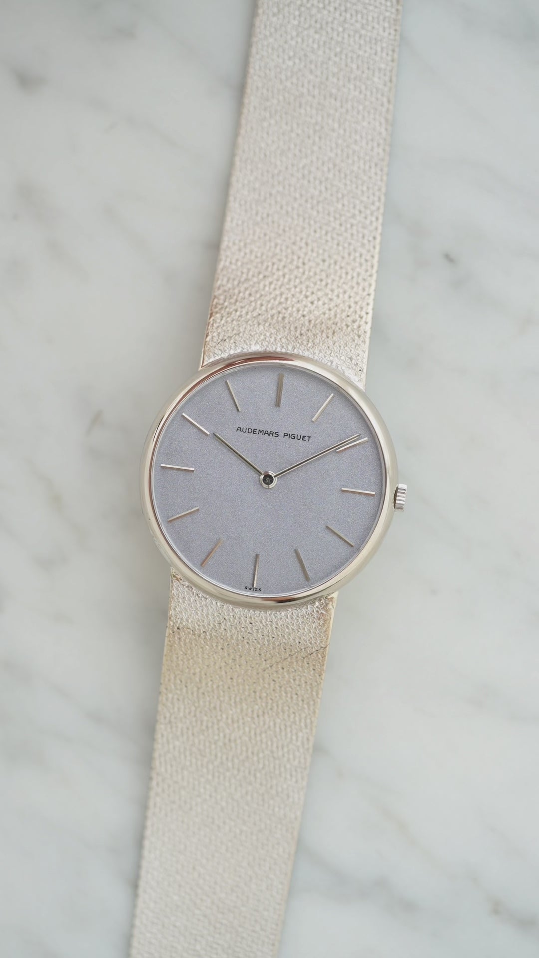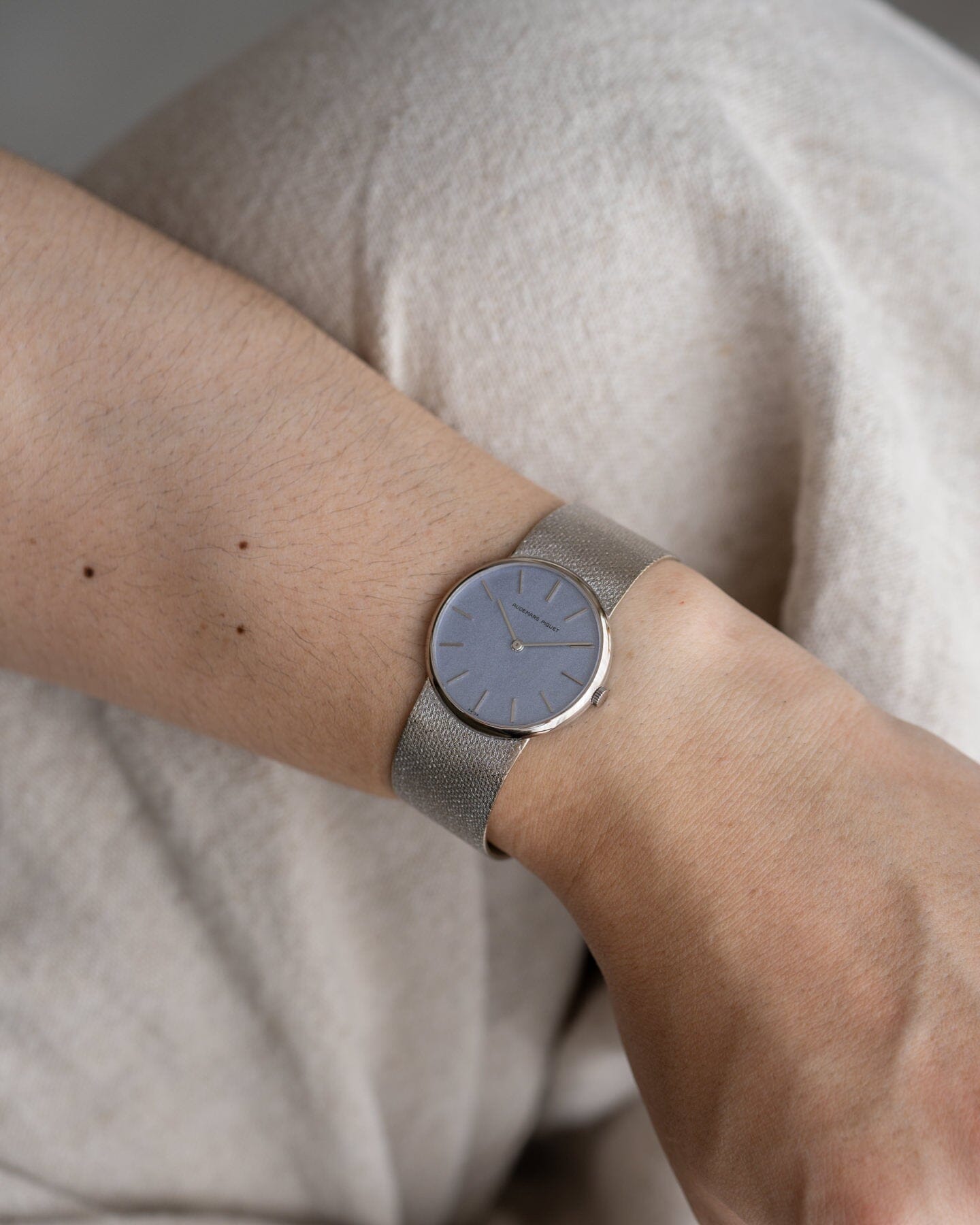 Both case and bracelet are made of 18K white gold. The case is a relatively small 31mm round case. It features a smooth bezel with a little volume.