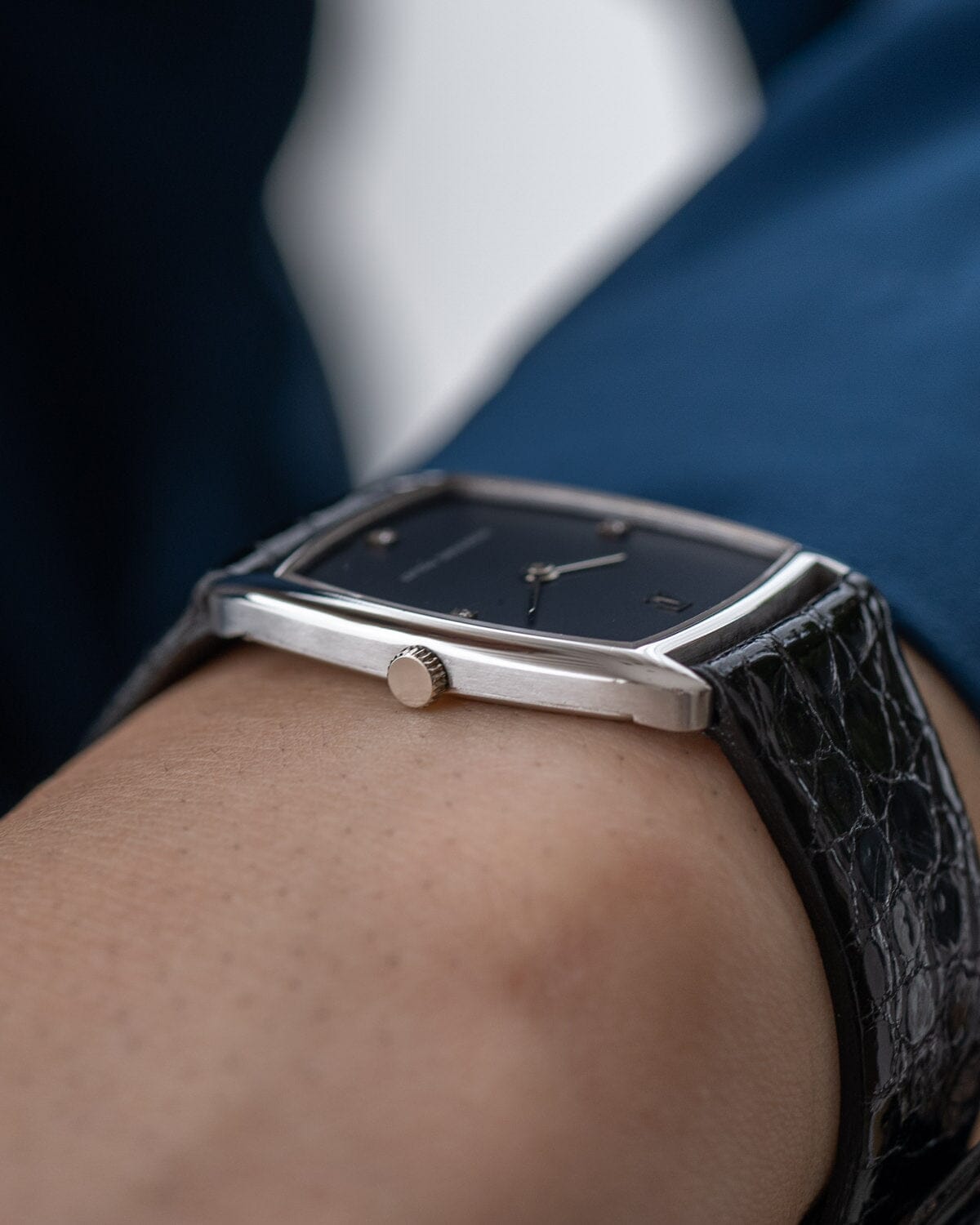 This watch is a dress watch with a tonneau-shaped case made in 1970s.