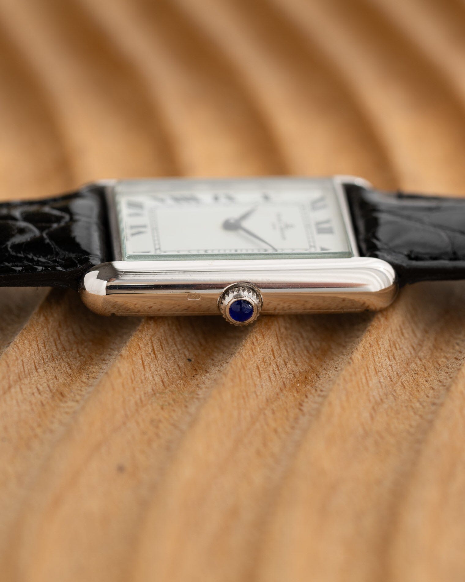 The case material is 18K white gold. A rectangle case reminiscent of a Cartier tank. The crown is set with a cabochon-cut blue sapphire.