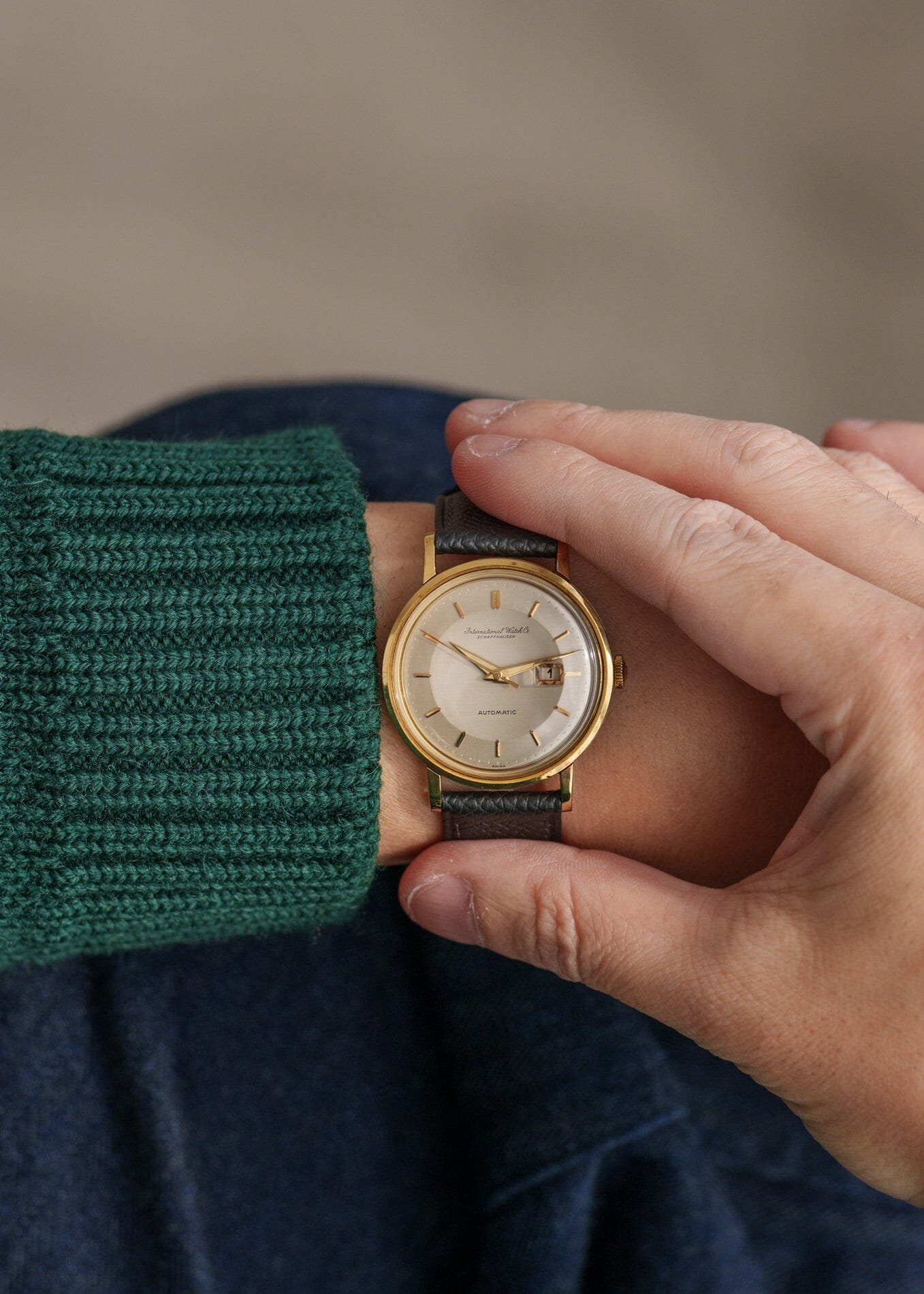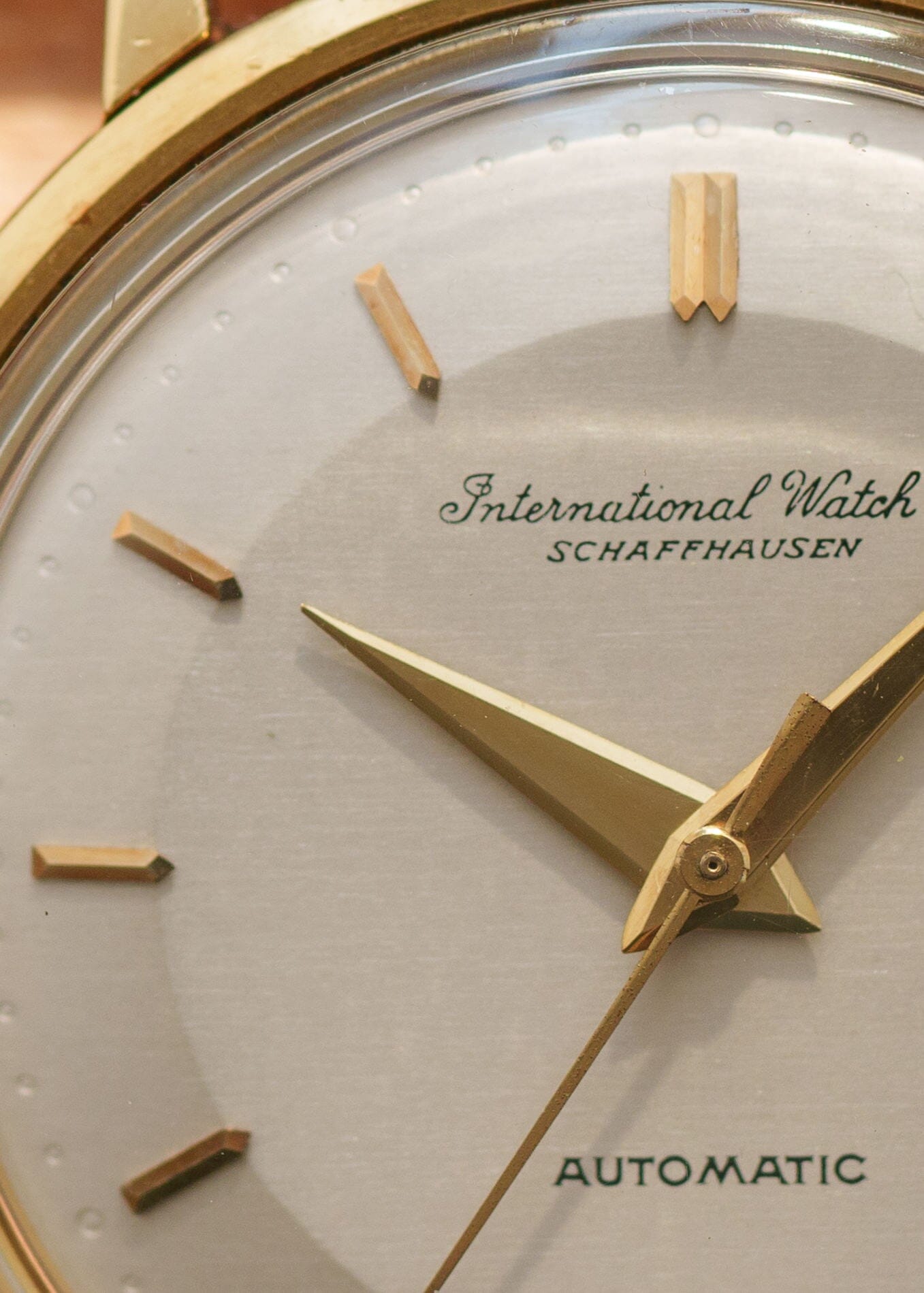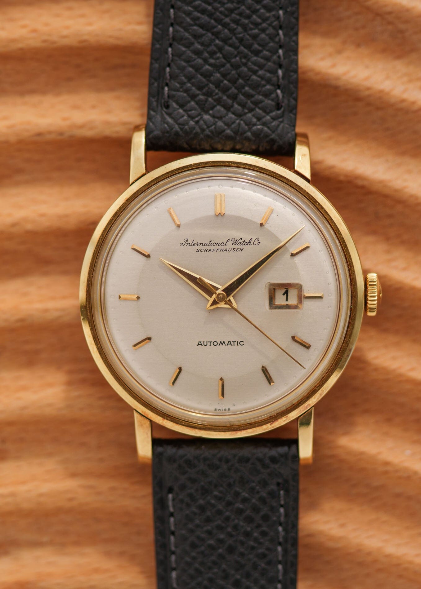 This watch is a self-winding round watch from the 1960s with a water-resistant case made of 18K yellow gold, a characteristic of IWC.