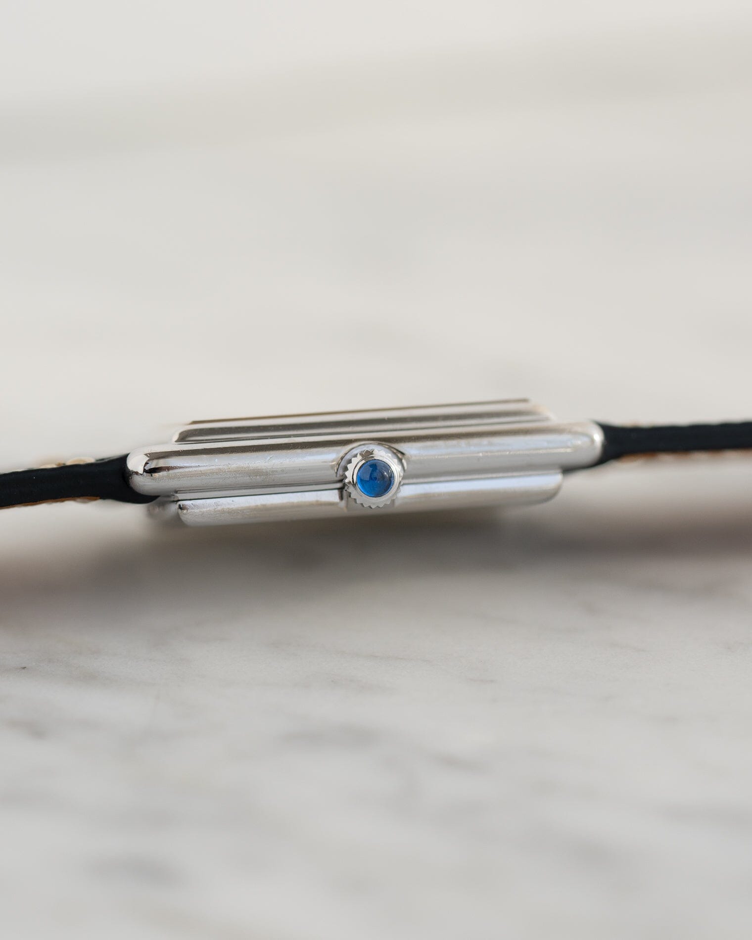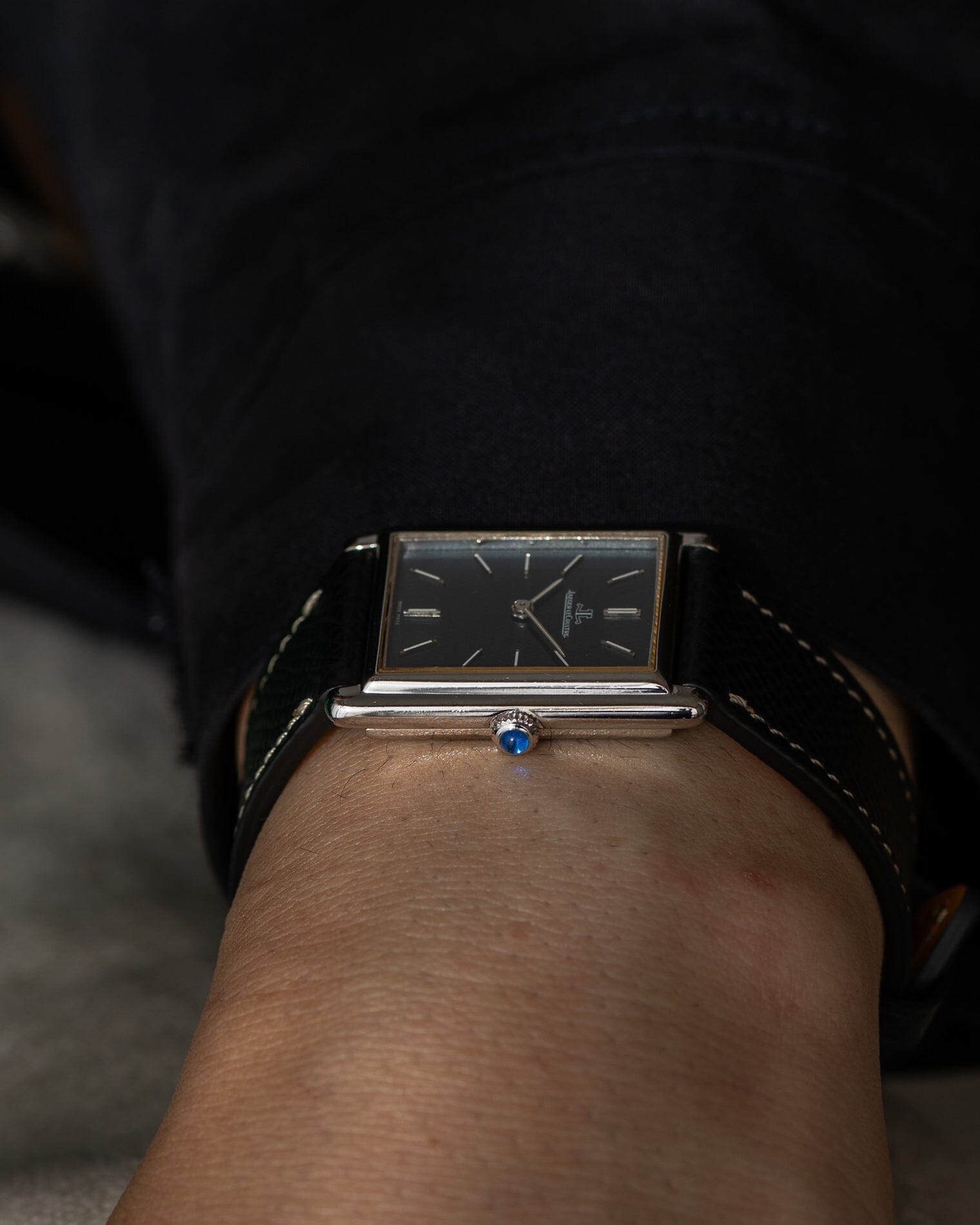 This reference 6029.22 is a manual wind dress watch from the 1970s. The case is made of 18K white gold and has a rectangular shape reminiscent of a Cartier tank.