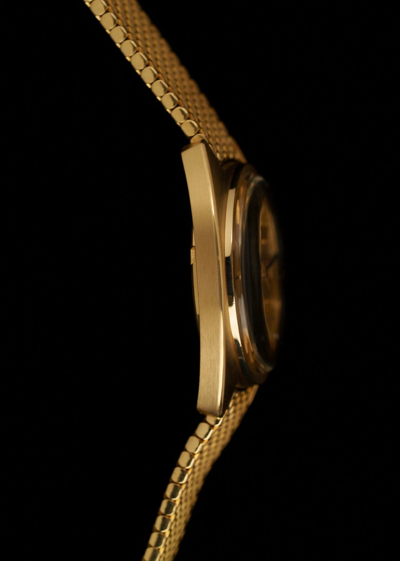This Ref. 168.009/168.017 is a dress watch with an 18K yellow gold C-line case, a linen textured dial, and a braided yellow gold bracelet.