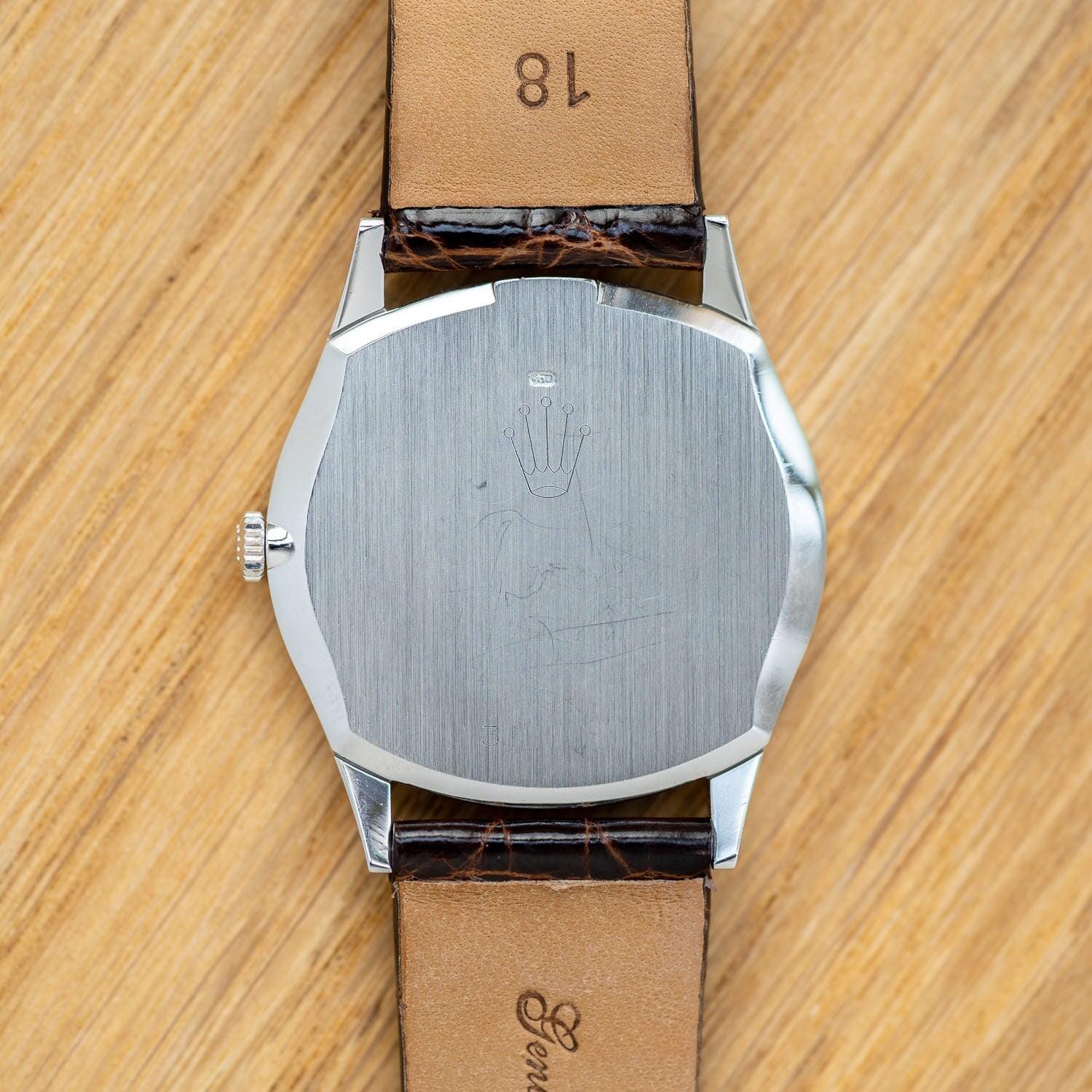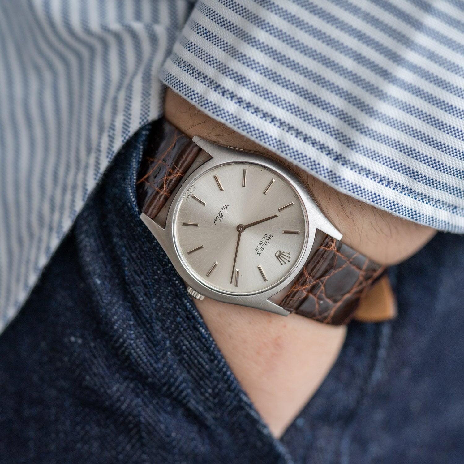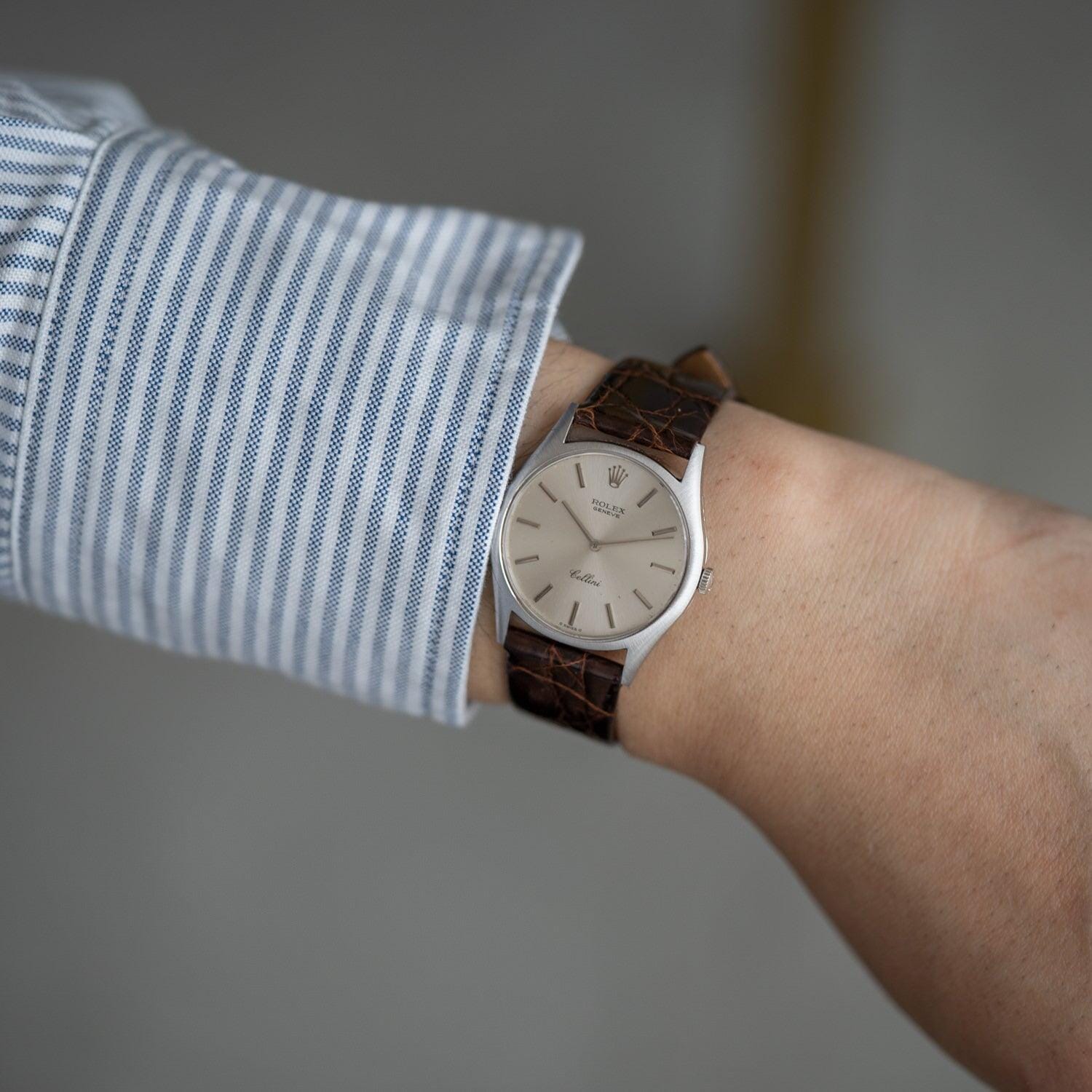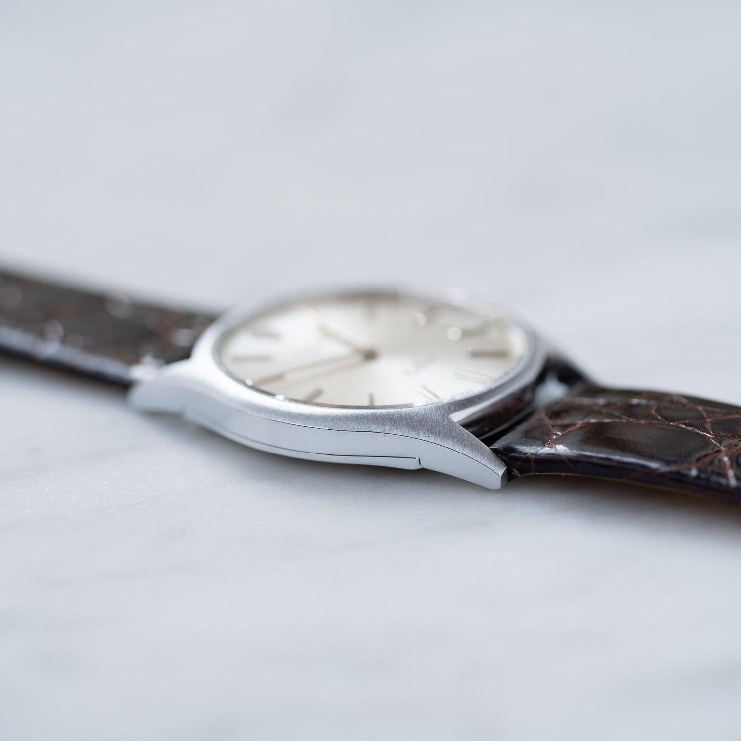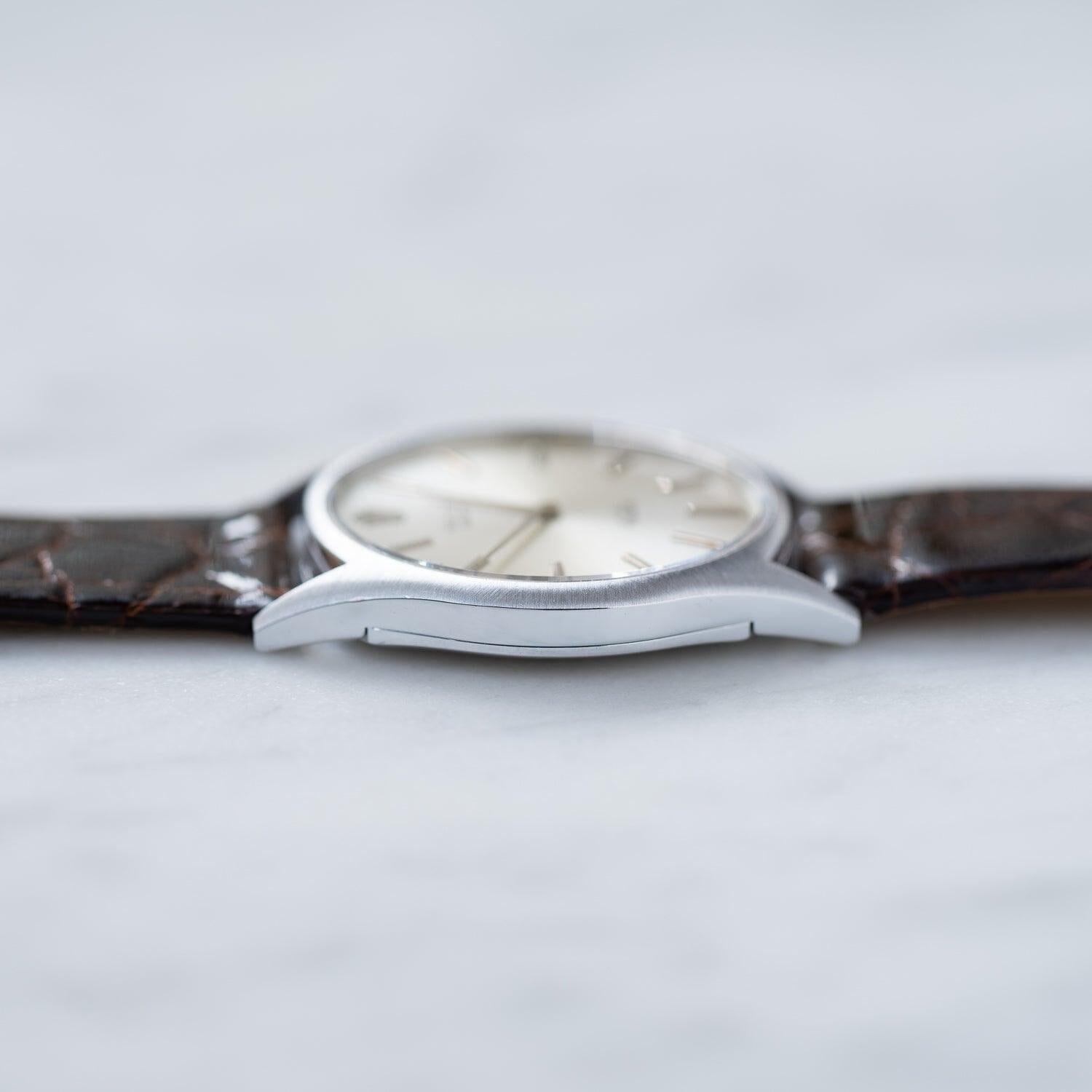 Brand: Rolex If you purchase from overseas, the strap will be replaced with a similar strap made of calf leather as an alternative. Rolex Cellini is a dress line that is particular about elegance without using the oyster case, which is the biggest feature of the brand. Although it is not as well known as the dress line and sports models of oyster cases such as Datejust, it has a long history and was born in 1928. The name "Cerini" comes from a person named Benvenuto Cellini, an Italian engraver of the Renaissance period in the 16th century. The fact that this Cellini is the only one in the Rolex collection that has the name of a particular person means that this Cellini has a unique standing position. case is Cellini, which is produced only in gold or platinum, but there are countless variations in the combination of the case, dial and hands. This watch is a model called Ref.3804 manufactured in the early 1970s. If you look closely, the front surface has a radial hairline finish. The back side is polished on the periphery and the inside is finished differently from the vertical hairline. I matched it with a thin and shiny dark brown leather strap.