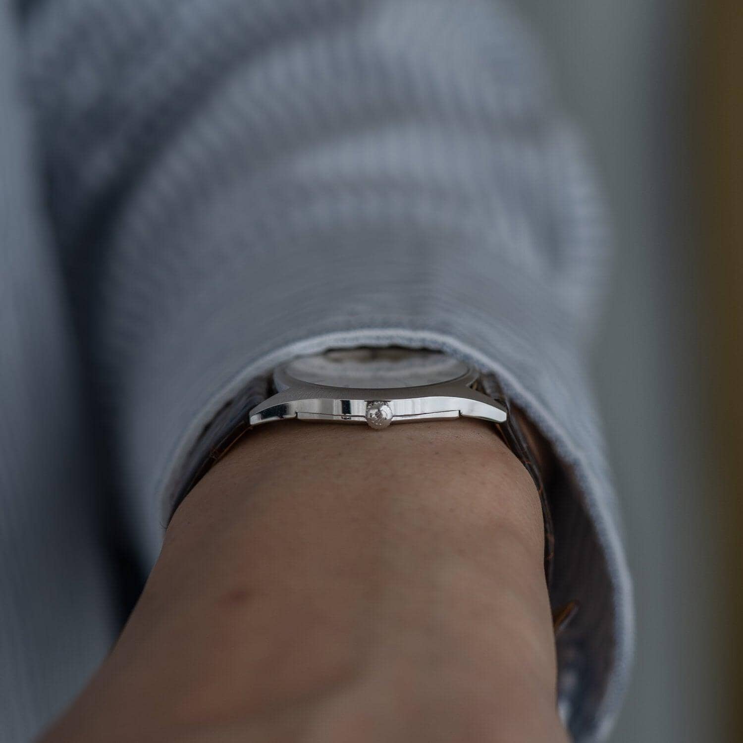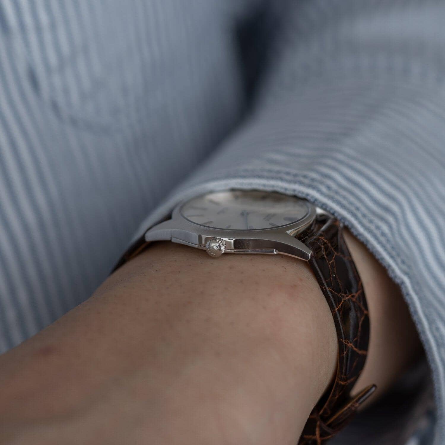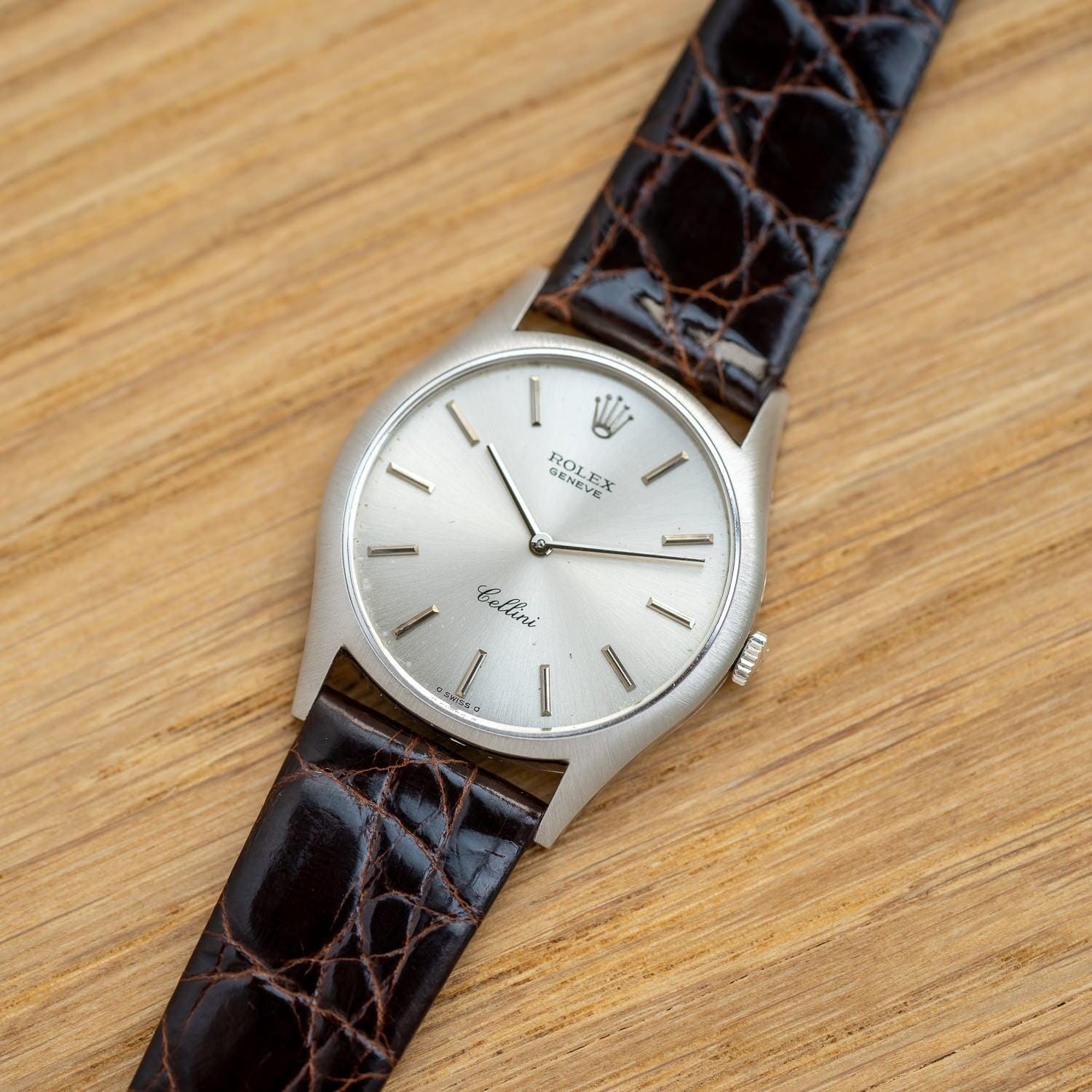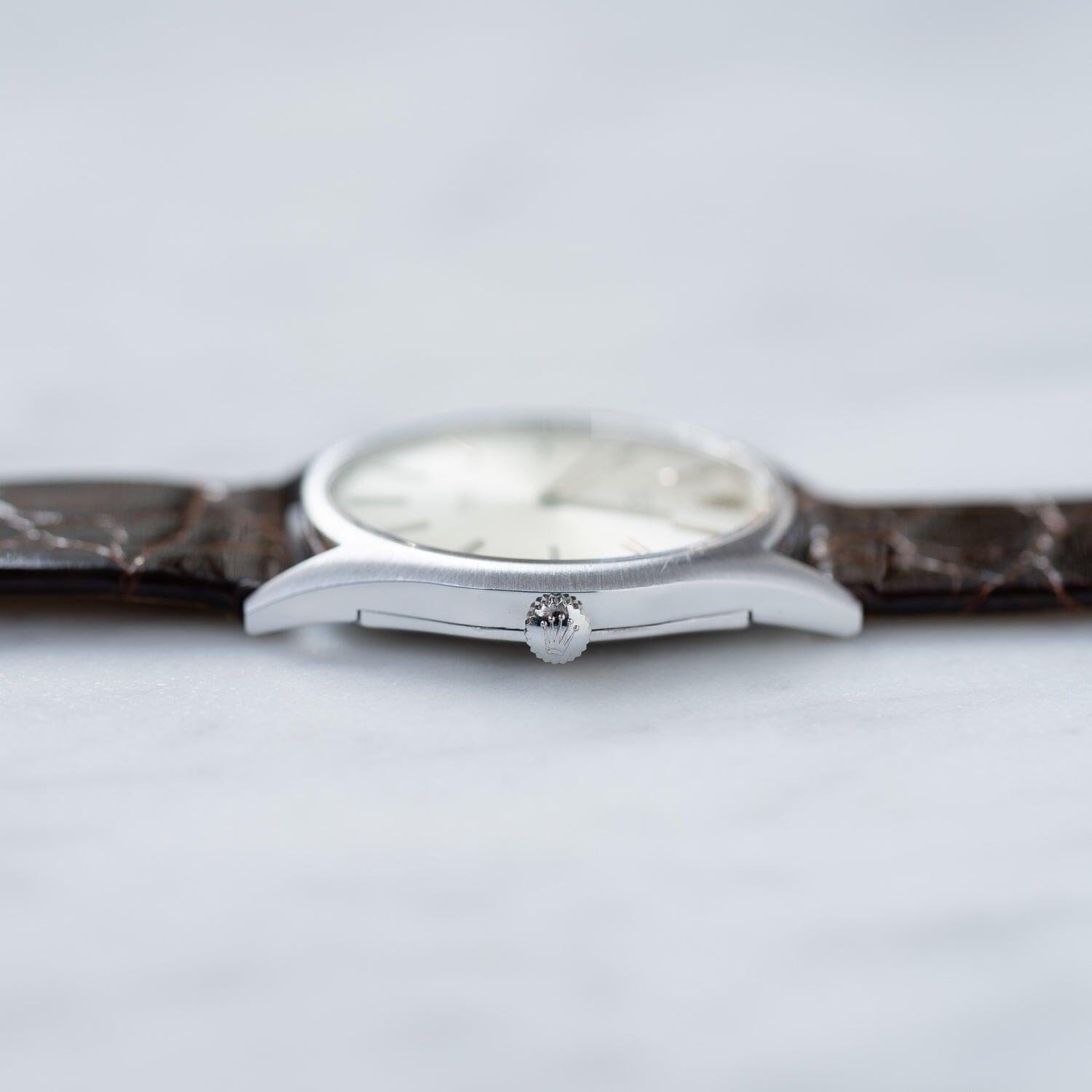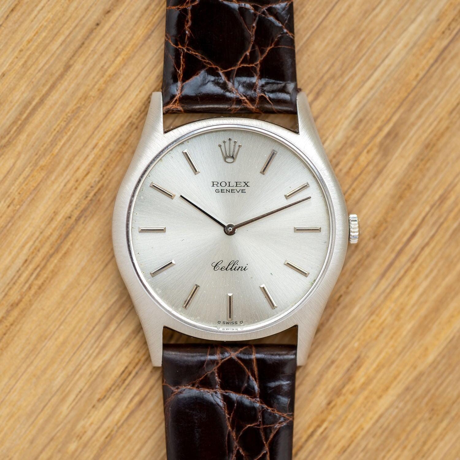 Brand: Rolex If you purchase from overseas, the strap will be replaced with a similar strap made of calf leather as an alternative. Rolex Cellini is a dress line that is particular about elegance without using the oyster case, which is the biggest feature of the brand. Although it is not as well known as the dress line and sports models of oyster cases such as Datejust, it has a long history and was born in 1928. The name "Cerini" comes from a person named Benvenuto Cellini, an Italian engraver of the Renaissance period in the 16th century. The fact that this Cellini is the only one in the Rolex collection that has the name of a particular person means that this Cellini has a unique standing position. case is Cellini, which is produced only in gold or platinum, but there are countless variations in the combination of the case, dial and hands. This watch is a model called Ref.3804 manufactured in the early 1970s. If you look closely, the front surface has a radial hairline finish. The back side is polished on the periphery and the inside is finished differently from the vertical hairline. I matched it with a thin and shiny dark brown leather strap.