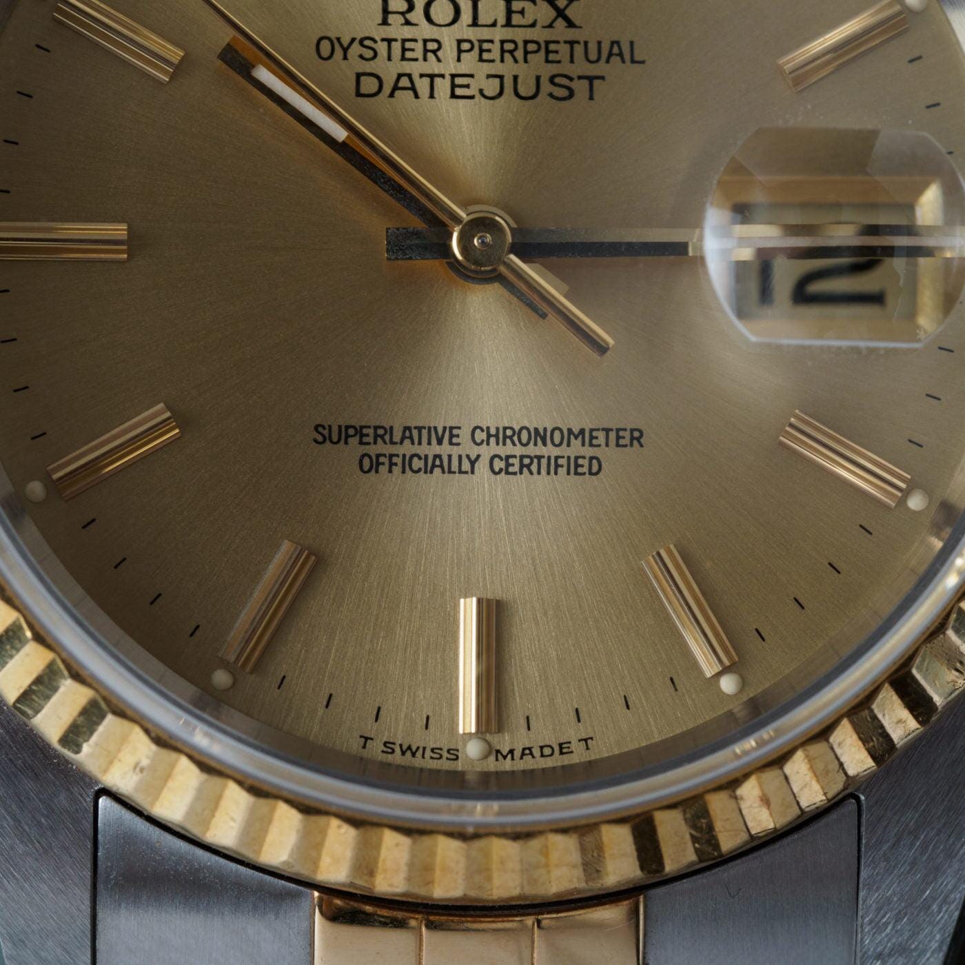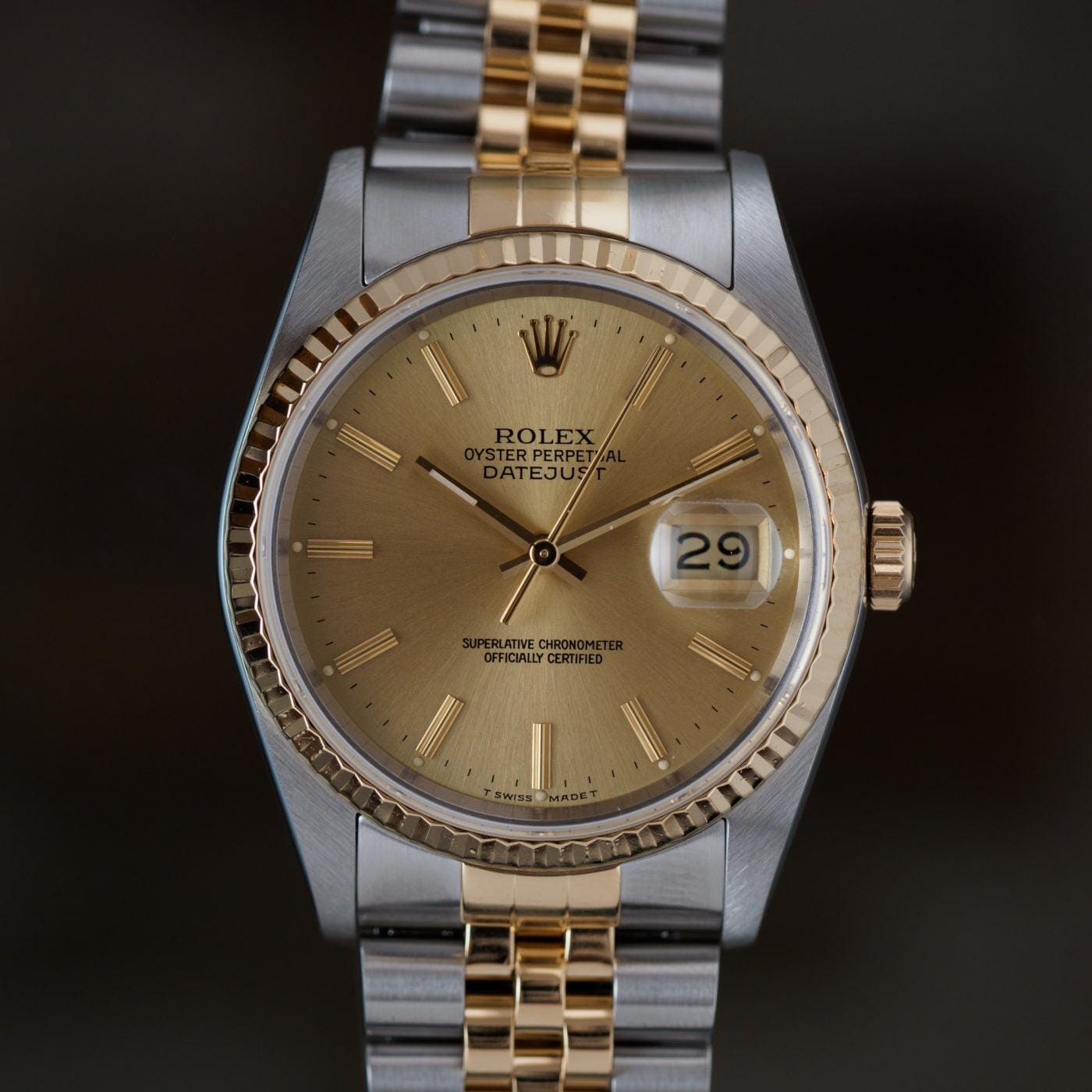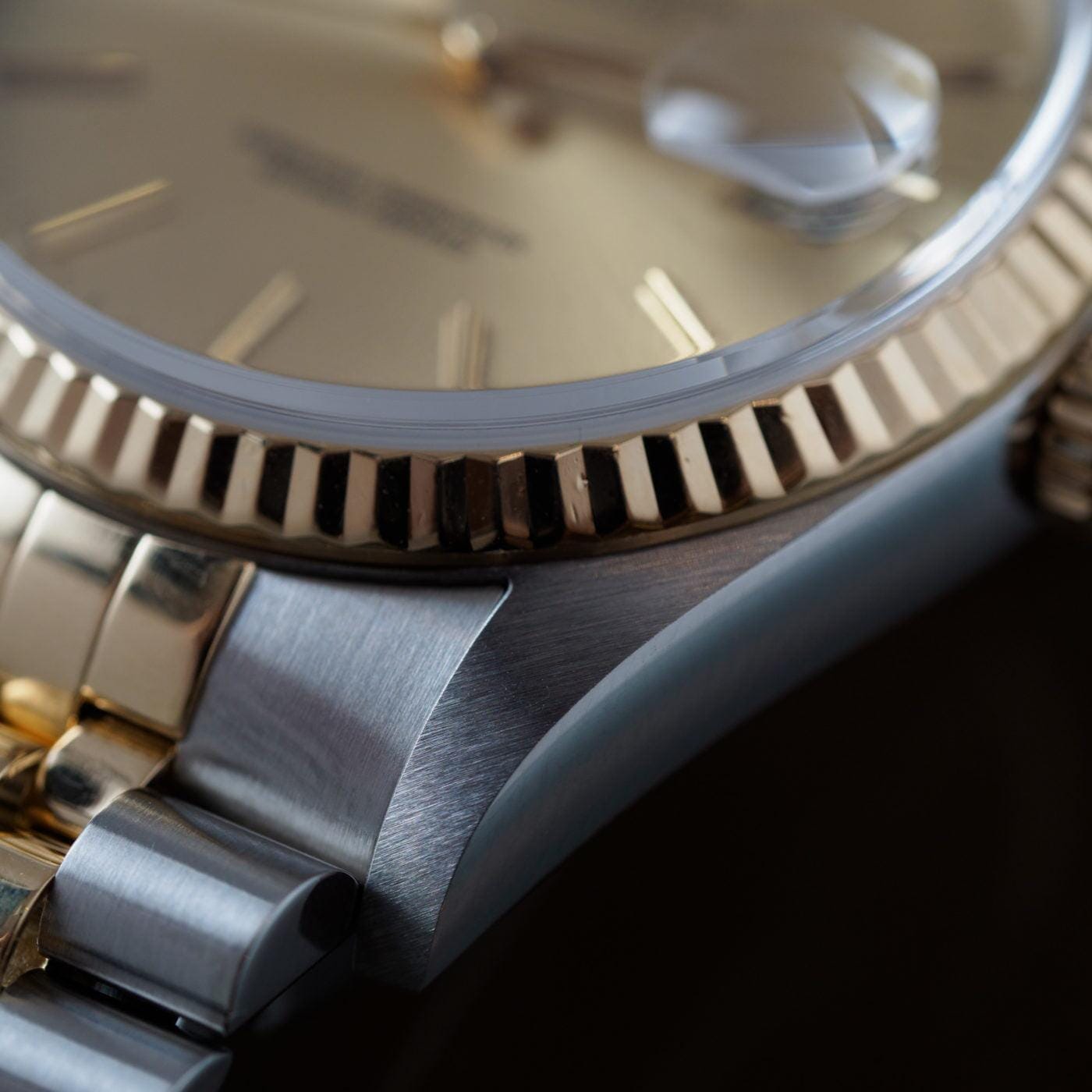 16233にはいくつかのダイアルデザインがありますが、こちらはシャンパンゴールドのダイアルにバーインデックスという極めてシンプルでクラシカルなデザインです。
